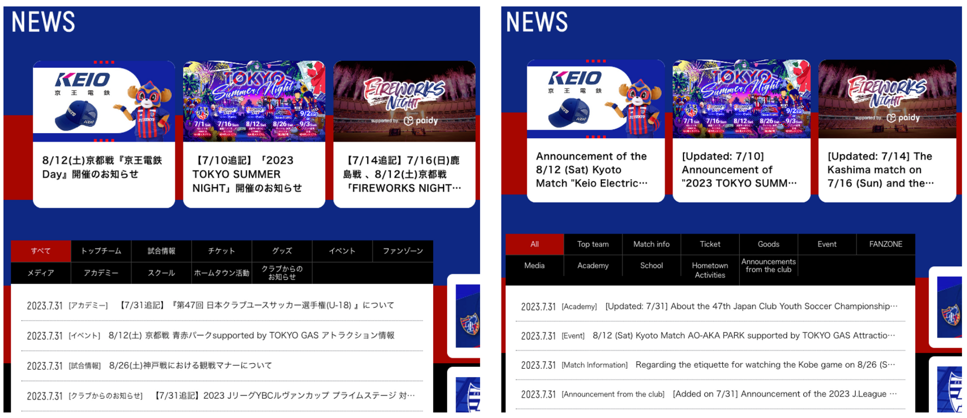 FC Tokyo dari J.League (Tokyo Football Co., Ltd.) telah mengadopsi solusi multibahasa kami, "Cistate Translation Proxy", dan meluncurkan situs web versi bahasa Inggris. Melalui situs versi bahasa Inggris, kami menyediakan informasi secara real-time dan efisien bagi wisatawan mancanegara serta warga negara asing yang tinggal di dalam negeri.